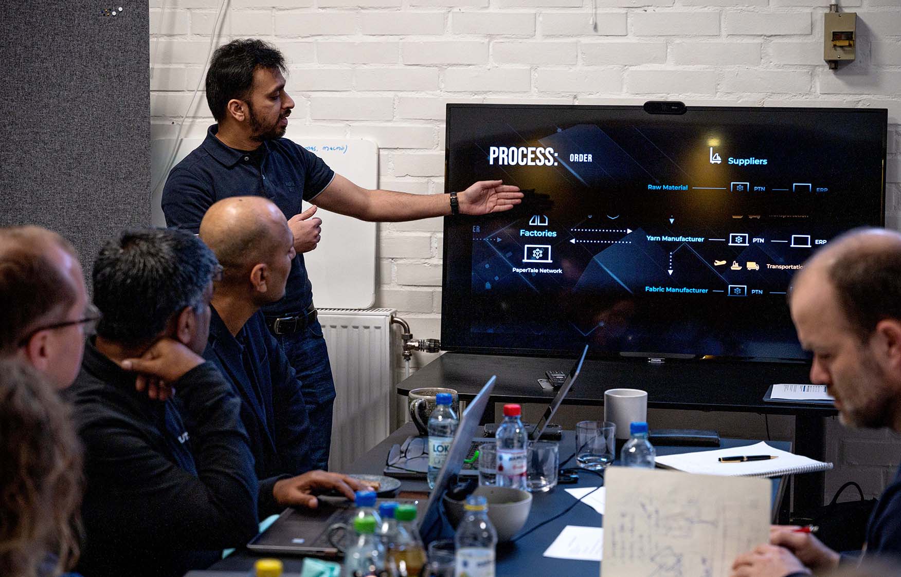 After years of hard work, meticulous planning, and rigorous testing, we finally launched our product for its first real-world beta test. One of our partner factories successfully implemented the solution. To mark this milestone, we hosted an event at Borรฅs Textile University, where we unveiled our mini-hoodie, featuring live supply chain dataโincluding environmental and social impact metrics demonstrating the system in action.
